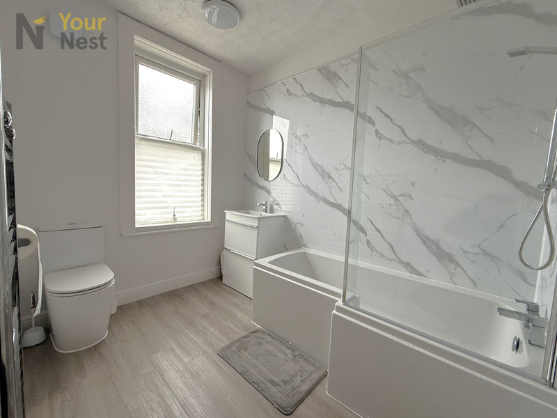 A standout feature of the home is its two bathrooms. The main bathroom is finished to a high standard with stylish marble-effect wall panels, a full-sized bath with overhead shower, modern fittings, and a fresh, contemporary feel. The second bathroom provides additional convenience with a separate shower enclosure, toilet, and basin — ideal for shared living arrangements.