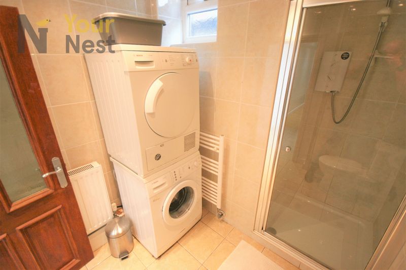 The large living room, complete with sofas, dining table, and original fireplace, is ideal for group dinners, movie nights, and study sessions. The kitchen continues the theme of practicality with wooden cabinetry, plenty of storage, and all the essentials — including a full-size fridge-freezer, dishwasher, washing machine, and separate dryer.