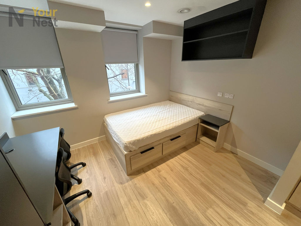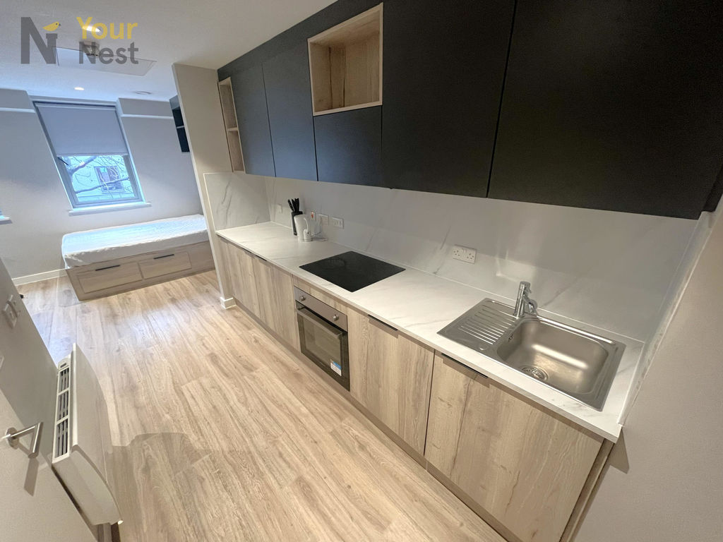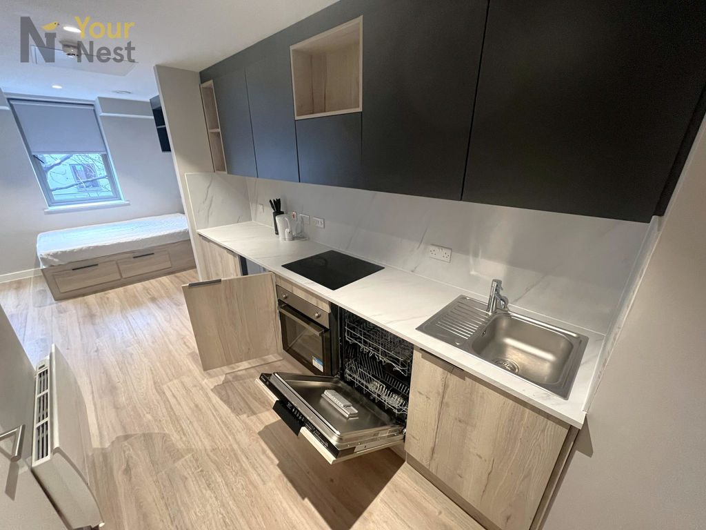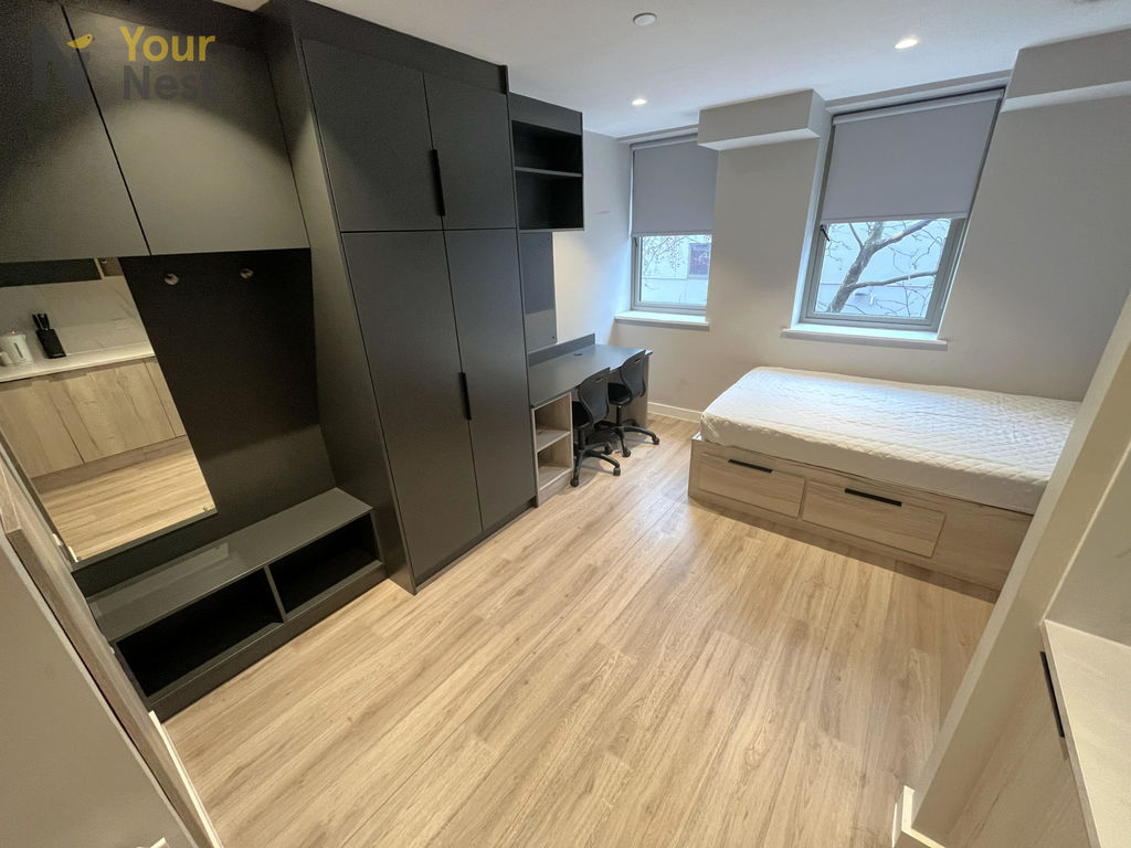 Each modern studio features a private en-suite shower room, fitted kitchenette with integrated appliances, a comfortable sleeping area, study desk, and ample storage. Residents also benefit from secure entry, high-speed Wi-Fi, on-site laundry facilities, and communal social spaces.