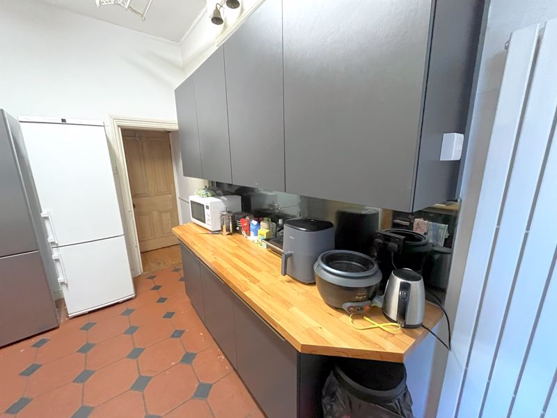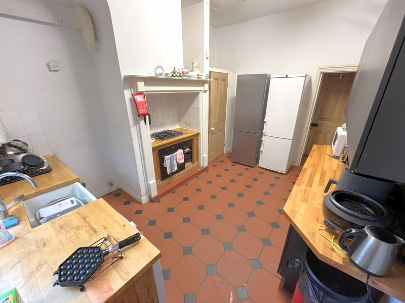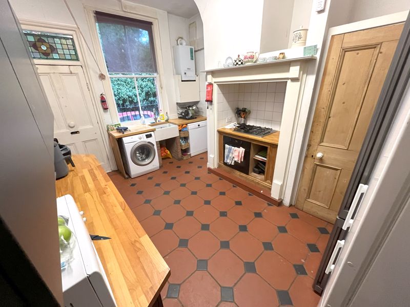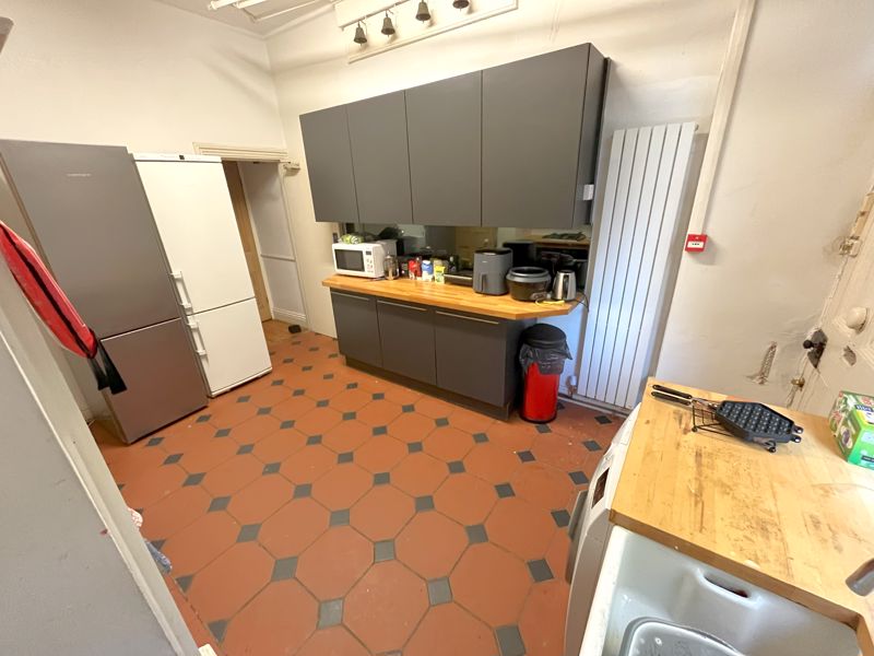 Featuring six generous double bedrooms, a large shared living area with comfortable seating and a full dining setup, and two kitchens—one main and one additional prep area—the property offers exceptional versatility and comfort. The interiors boast wooden floors, high ceilings, and lovely period features, including ornate fireplaces and tall sash windows that fill the rooms with natural light.