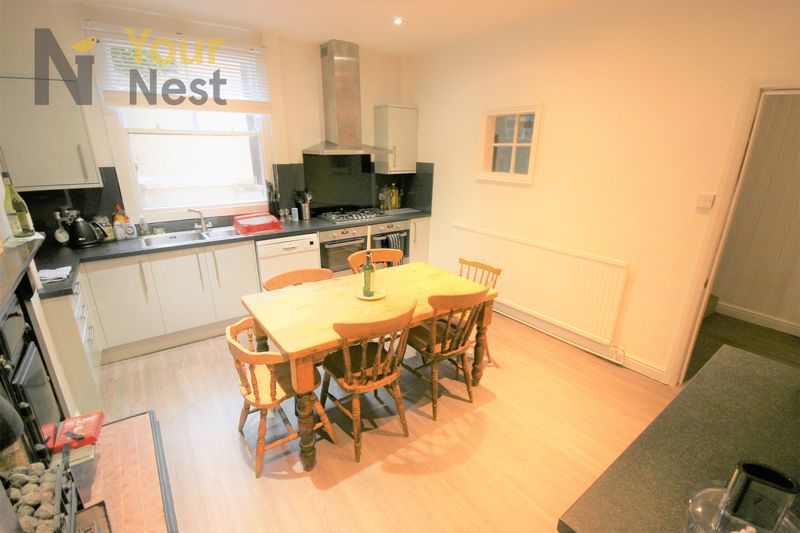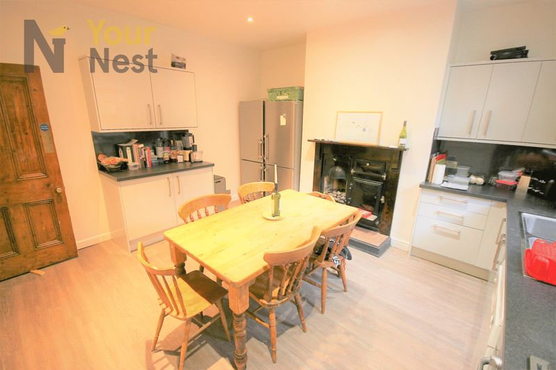 The modern kitchen is a standout feature — bright, open and fully equipped with double ovens, gas hobs, and two large fridge-freezers. There’s also a generous dining table for group meals and a beautiful cast-iron oven fireplace adding to the home’s unique character. A separate utility space includes a washer, dryer, and extra storage — ideal for busy student life.